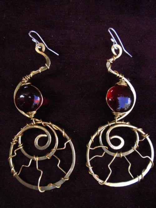 All of these earrings are made with bronze, copper, and/or silver wire formed to let the eye dance with the piece while wore. The stones, glass, seeds, and bone used here are added for a perfect touch of color to accent the piece. The fantasy seems to pleasantly never end!